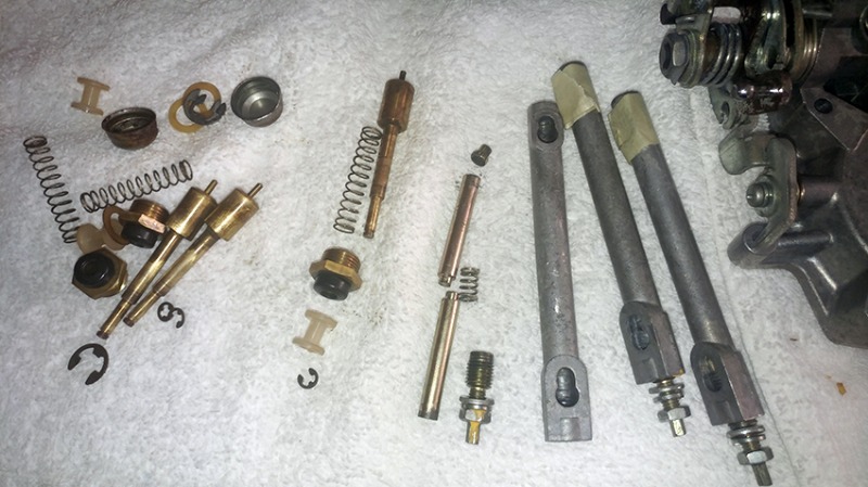 Stan. I'm looking at the pic of you linkages and am again compelled (lots of compelling this past week) to suggest you revisit your thoughts about leaving the main linkage shaft. Yes, the "Stacked" end must come apart but the '79 rebuild covers this Chinese-Puzzle . That heavy rust on the "ball-arm end" will wire-wheel off and with some of your profound elbow-grease, will polish (brighten-up) as will the other parts on the shaft. I know you'll polish the 3 link-rods!!!! For what it's worth I polish the internal parts too. I prefer to do everything I can to keep linkage drag to a minimum. The choke plungers should be polished lightly. No need to go crazy on these but a shiny stem and seal-end will allow the plungers to move freely with no drag, and this is important because the only thing keeping the choke-plunger seal against the seat is that one little spring (per choke). Wisely you've left the dust-cap on the plunger retaining nut !!!! Reading a bit further, you answered my Q about the diaphragms. Good to hear (by omission) that you're leaving the throttle-shaft seals, alone. The 2 steel throttle- shaft caps will polish.! A touch of wax now, and periodic cleaning will help keep the rust from returning on the steel pieces. The needle-valve bodies are giving your trouble? If after some soaking in a penetrating oil and some heat, they still won't budge - blow/wash out the P.-oil and soak that end of the carb-body (ONLY) in some lacquer-thinner. (Kawboy's laughing now - private joke!)