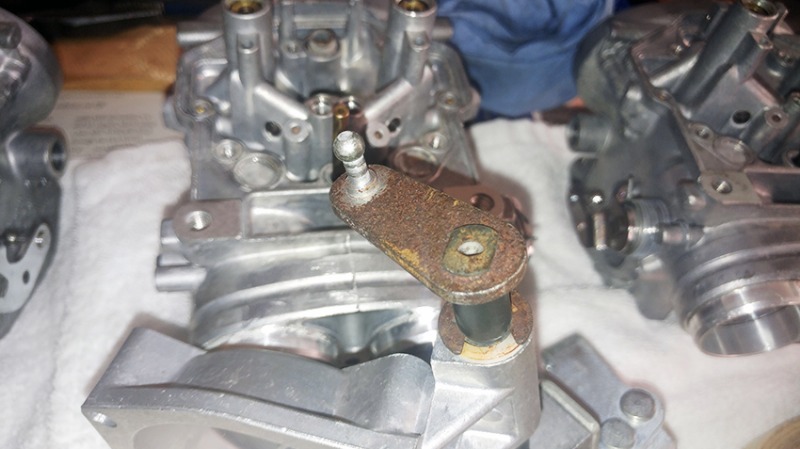 I am not going to disassemble the center assembly linkage. The cover is clean and I will polish it a bit just to tease Kawboy, haha I know I can't remove the tiny discolorations, but you can't even see it on the bike. Looks kind of cool like made from marble. The metal ball joints at the ends of the throttle shaft are rusty, but some brushing and metal polish will take care if of it. I might spray at it some zinc rich coating, which will make them rust resistant and look silver at the same time. The springs and everything else look clean and shiny. All is tight and moves freely.