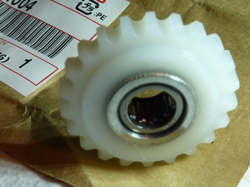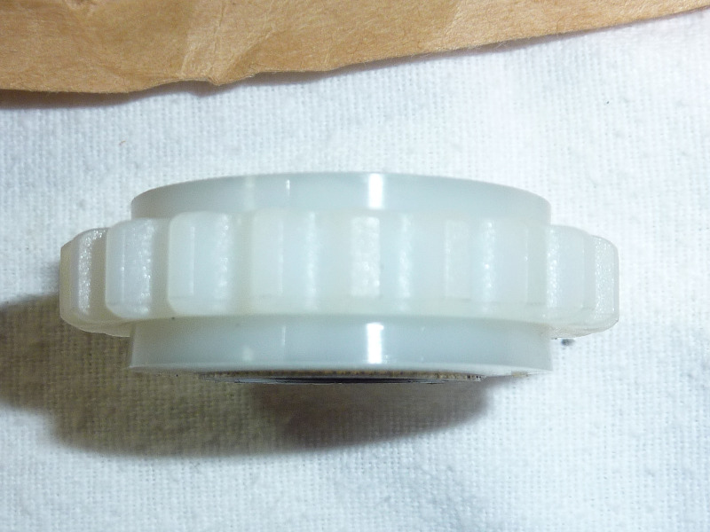 8 years 4 months agoscotch wrote: If a Steel gear is out of your budget I wouldn't hesitate to use the plastic gear, shown in photo. Yours has lots of life left. Mine - 1980 - 80,000Kilomemters is worn down significantly more then the one in the photo - still adjusts with a manual tensioner, is quiet and will stay in until it HAS to be replaced. The grooves would be from the chain-links.