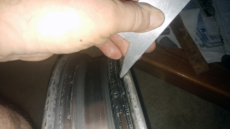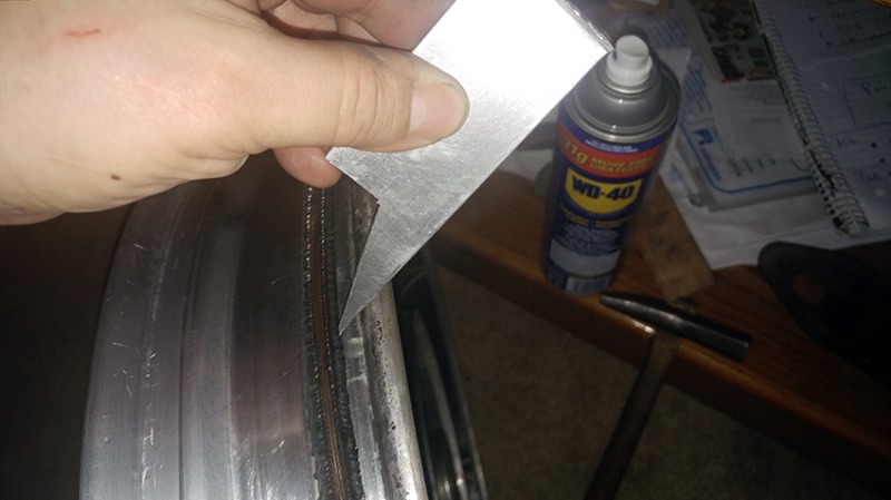I applied some WD40 and gradually hammered the aluminum wedge around the wheel moving the leftover 'rings' of the tire towards the center.