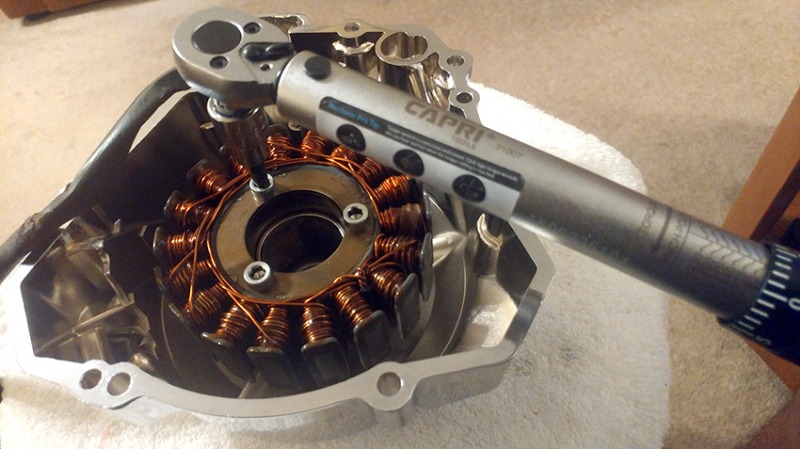 As recommended, I used blue Loctite on threads and these three bolts are torqued to 69 in-lbs.