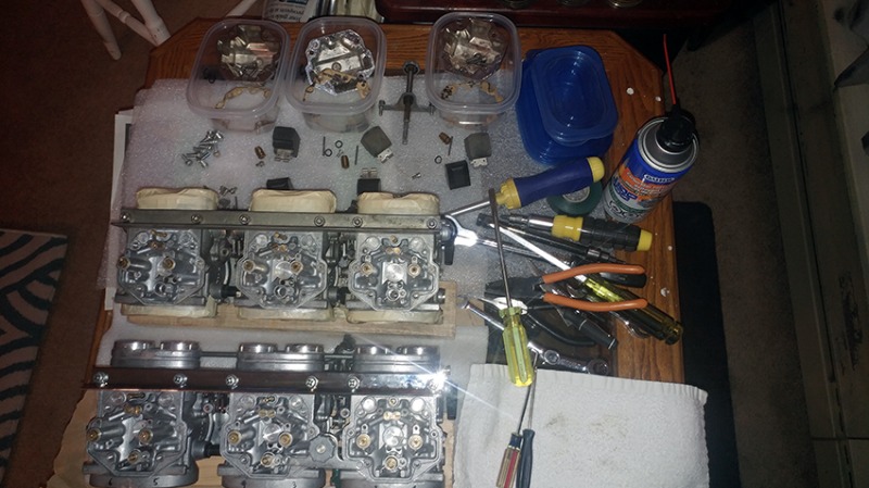 The only thing left is adjusting the float heights. I just closed the bowls up for now so no dirt will come inside, and do the float level adjustment and any dry fine tuning later tonight. I also need to find out what's the right air/fuel mixture screw adjustment - how many turns? Right now I keep them closed all the way.
