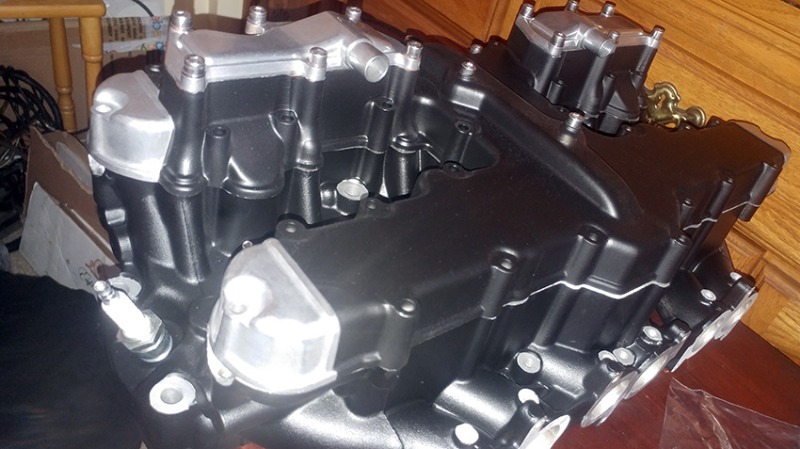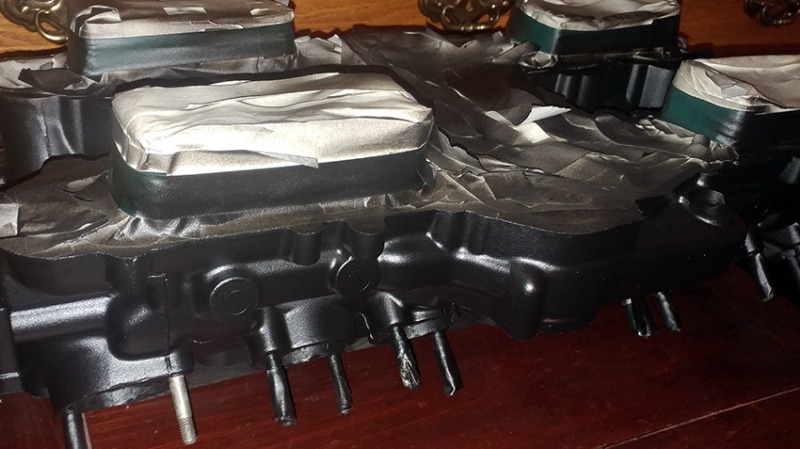 Despite the first of the the reed valve covers looks dull in the photo, they are actually quite shiny. Not as much as scotch's, but fine. I had an idea about chrome plating them, but I don't feel the need of doing it yet. They will be on and off later for valve adjustments, and they look just fine now. The edges are also sharp after removing the masking tape as well. Kind of hard to show everything off in this light. I didn't tape the bolt holes on the cover as they are not crucial and don't require much torque, and when I tried the paint holds up very well.