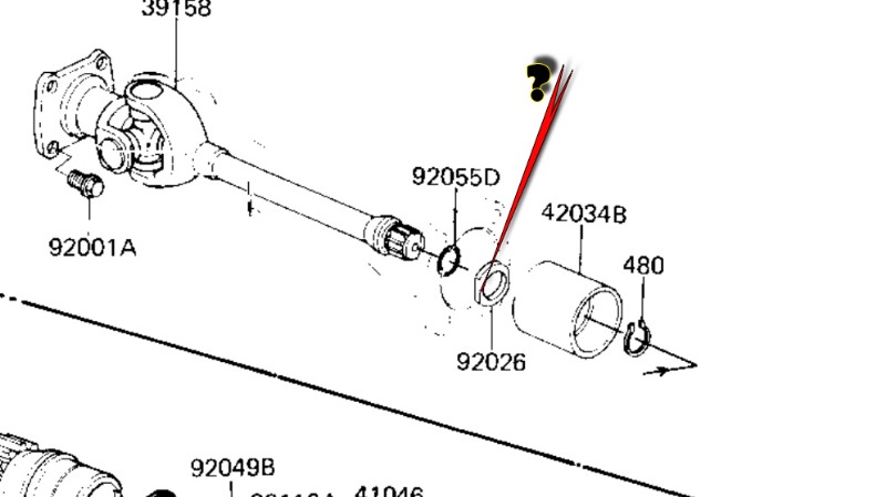 Without going to the manual to see how Kawasaki wants you to set up the fit of the drive coupling on the shaft, item 92026 appears to be a nominal shim and 92055D is a selectable shim to set the lash of the fit of the drive coupling on the drive shaft. If 92026 is missing I would expect a lot of lateral play between the coupling and the spline collar (back and forth movement of the coupler on the shaft.) Are you sure the spacer isn't stuck to the coupler and you're just not seeing it? Something's funky.