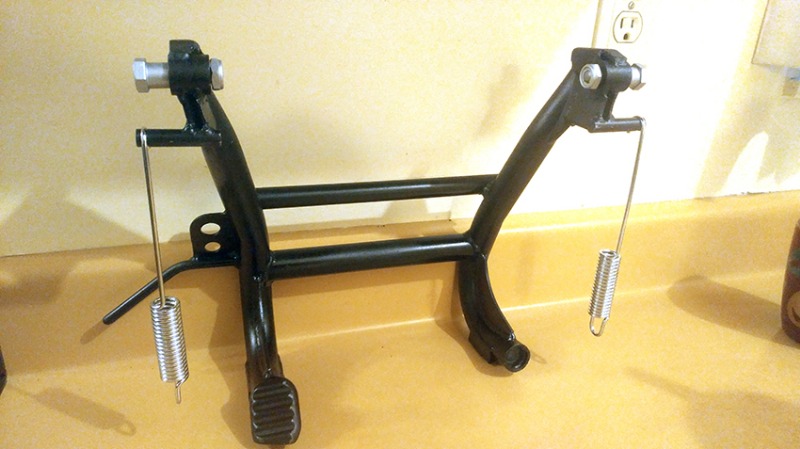 I've had the center stand painted and sitting for a while. Now the chrome plated springs joined it and it's a complete set. I used PlastiKote chasis and grille guard paint. It seems very tough. I think it's good for touching up the frame.