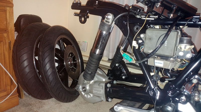 Tires mounted! Need those forks done as well!! The only thing holding me back will be the electrical system and fuel system.