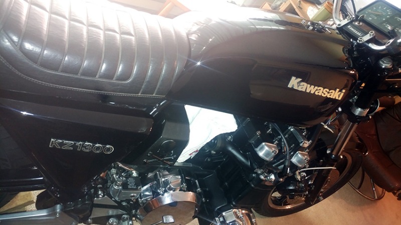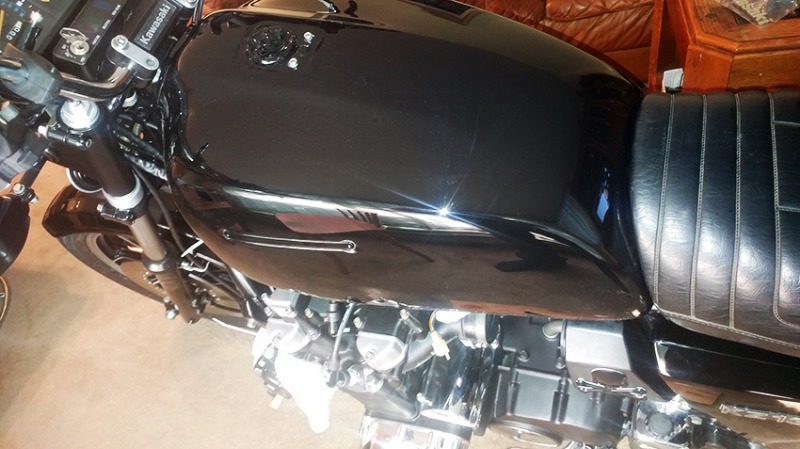 It's Kawaski ebony, the proper color for my 1982 A4 model. I left it without stripes for now - they can be easily added anytime, he told me, and sprayed again with clear. But for now, I like this simple basic color look. Great step forward in this project.