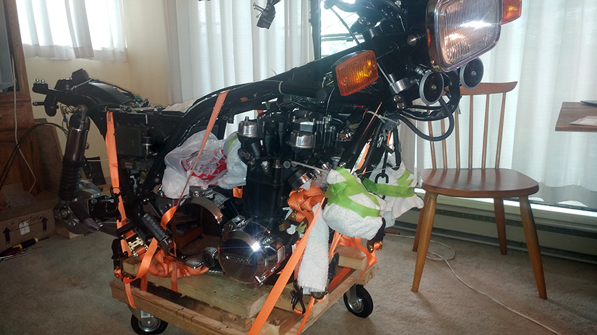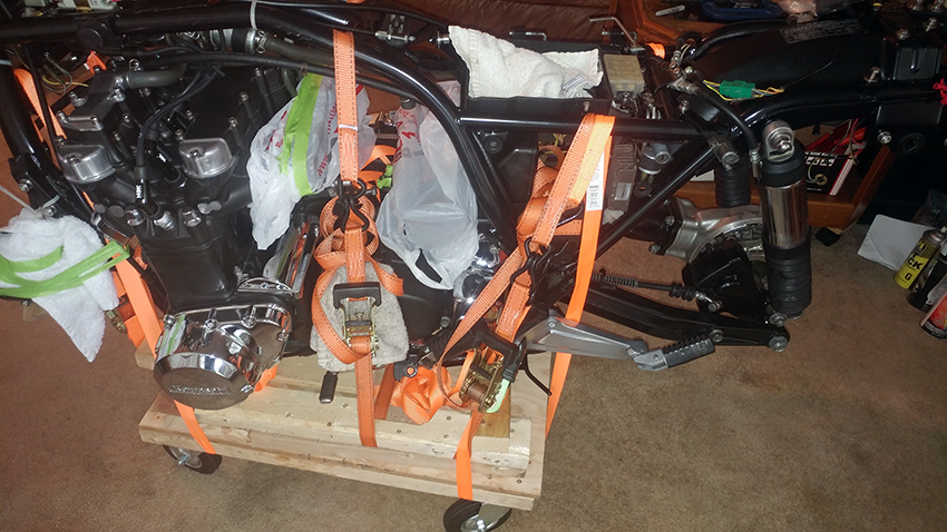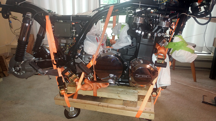 Just to report that the bike is on the ground and already on it's two wheels. It went very smooth, maneuvering it was very easy with my two hands. No strain at all! The key for such ventures is to have four swivel caster wheels.