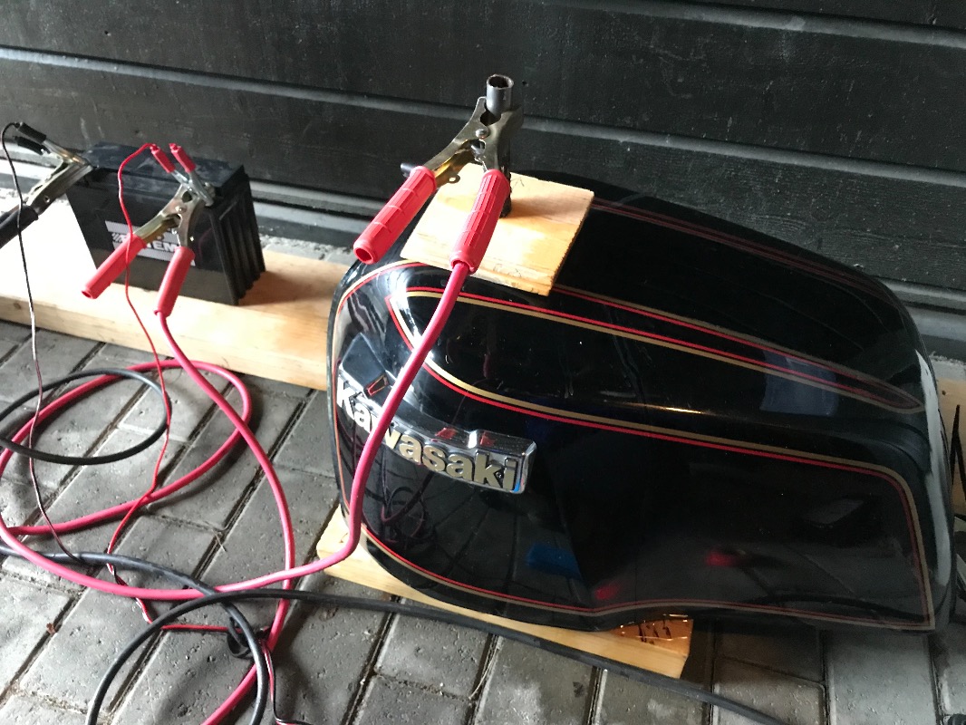 Have started a slow rebuild of my 85-model. Today I started to clean the gas tank. I have read that electrolysis can give good results. It’s cheap and effective. I have never tried it before but I wanted to give it a try.