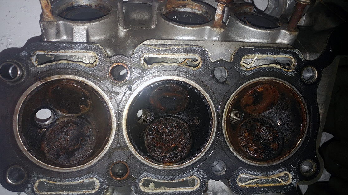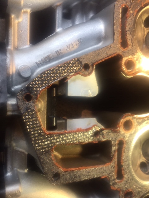 1) no need for liquid gasket when using a proper head gasket as it comes with its own 'soft coat', you can see from the pics that the extra (very thin!) layer of liquid gasket (in red) just squeezed everywhere it should not have gone