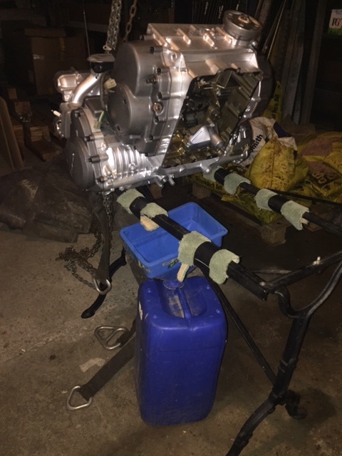 Ok, got the wheels off. I decided against removing the swing arm as it felt fine and I know from this forum it is a b*tch to remove. So Ibanded it up and now the chassis can be handled by two people whilst a third manipulates the engine in - which has the oil pan now removed.