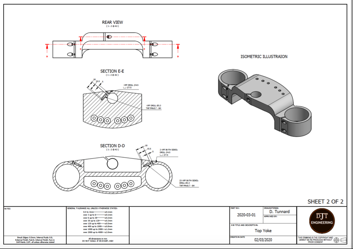 My tyres have still not arrived, but finally I have had the drawing of my top yoke back. The guy (I found him on peopleperhour) did a fantastic job of interpreting my rough drawings with measurements into a proper tech drawing. Based on that he also created a 3D CAD file which can now be used to mill a block of aluminum (or steel) to create my bespoke top yoke. Benelli front suspension and bottom yoke married to a bespoke top yoke through the original Kawasaki steering pin.