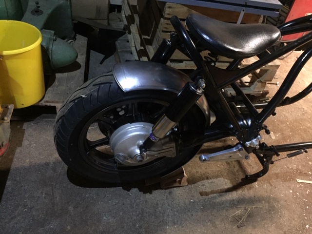 Got a rear fender. Still full size, have a play to see what looks good. But can't affix yet as the stance of the bike will change with the engine in. But have decided how to fix this to the unsprung part of the bike : four stiff steel brackets onto the end of the swing arm.