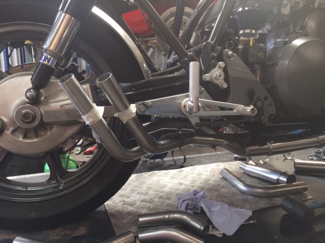 Bike is still with the exhaust guy, who is having trouble fitting down pipe no 1.