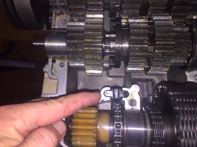After that the secondary drive shaft can be dropped in, with the new secondary drive chain attached, as well as the water pump and camshaft chains. Make sure it is synchronised with the crankshaft by lining up the timing makes on both shafts and counting seven chains between them (page 109 of the manual). You can just make out the mark on the left hand side, then you can count seven links to the right and there ,barely visible, is the other mark.
