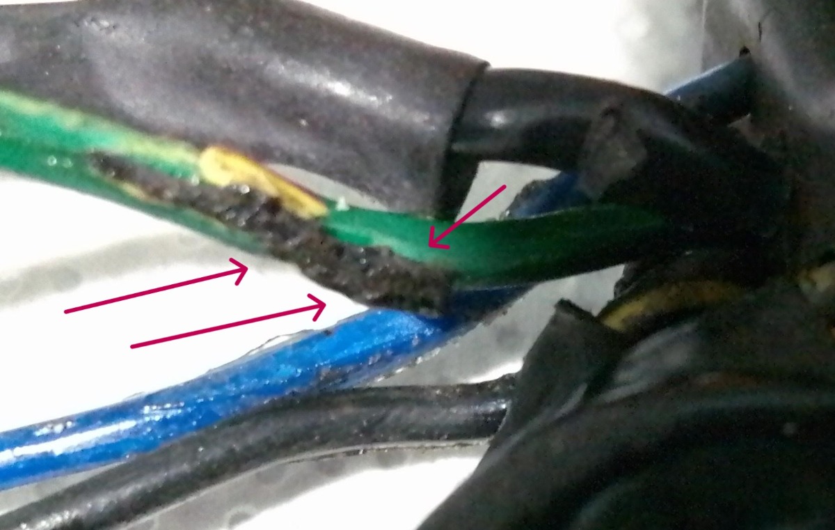 The green output wire still has traces of burnt plastic attached to it.