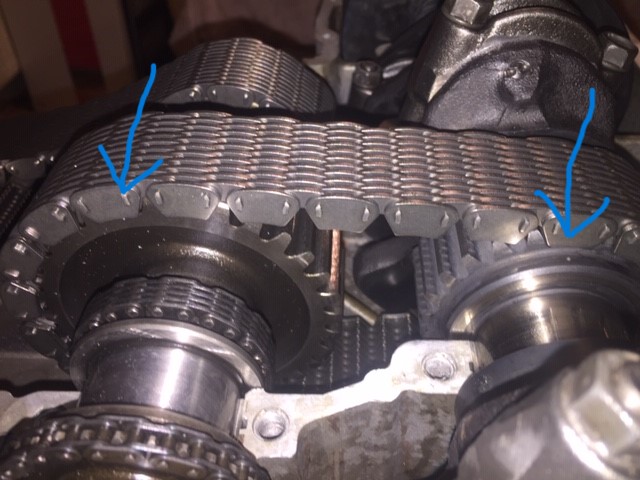 2 years 1 month ago - 2 years 1 month agoI counted seven links back from the mark on the output shaft and couldn't see the mark on the crankshaft.As for the timing mark on the crankshaft, I would suggest you get the secondary shaft in position and then count forward 7 full links and you should be able to see the mark on the crankshaft and confirm it. Then if necessary re-punch the mark or put a score line on the crankshaft so you know which tooth to use for alignment.