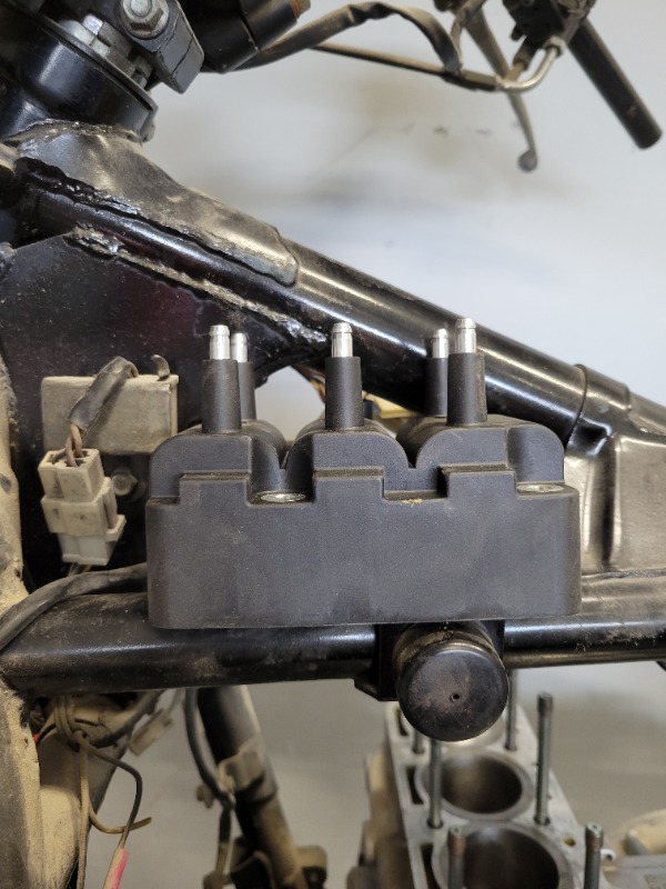 So I'm sitting on a stool looking around at everything and I happened to look up at the frame where #1 - #6 coil is located and the spot in the frame area is quite large and I'm thinking, would that 6 pack coil I got fit in that spot?? So off I go and find the coil and bring it up to the garage and try fitting it. Sooooo close but no cigar. But if I cut out the tray that the coils are mounted to and form up a bracket, I'll be able to sneak the coil pack up there in the frame and it will be up tighter than when the stock coils are all mounted up.