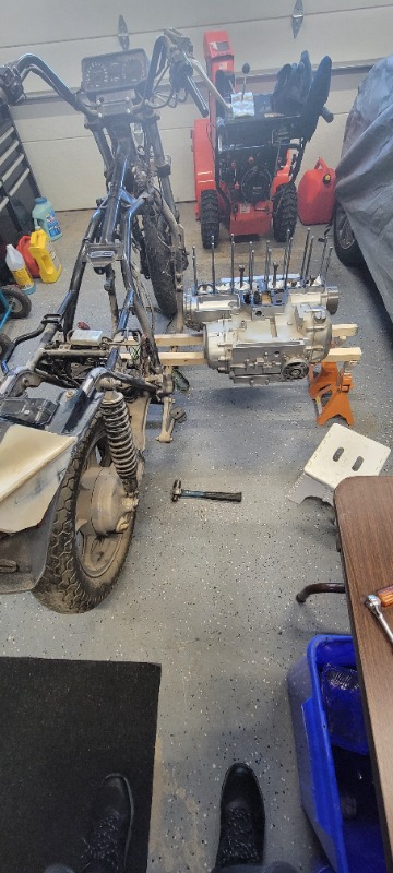 Took off the oil pan and oil pick up tube and I had my flat surface.. 2 pieces of 2x2 pine would hold the engine high enough to clear all of the brackets. A couple of car stands would support the 2x2 once the engine was out. Then all I needed to do was raise the engine in situ and set it on the pine 2x2's. Got a rachet strap and slung the engine off of the center frame tube and raised the engine. Installed the 2x2's and set the engine down on them and supported the outboard ends with the car stands. Removed the rachet strap and then slid the end out. What a treat. Nice and easy. No bumping into anything and damage some part of the engine.