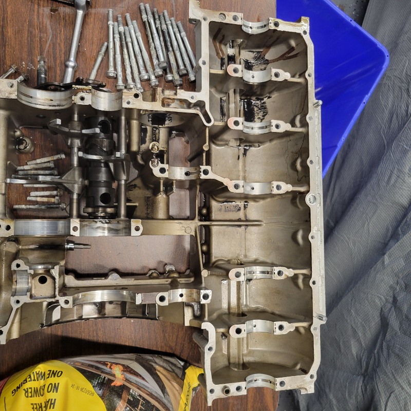 1so I found myself spitting quarters this morning. I'm looking at the lower crankcase at the main bearing journals and I see plain bearings and grooved bearings and I've never seen that before. So I go and look at the main journal bearings in the upper half and I see they are mixed too. Bearing that in mind, I also remember when taking out the 11 crankcase upper bolts, I could only find 9 of them. Not wanting to miss any, I referred back to the service manual and found the 2 empty holes. There is absolutely no reason for those bolts to have come out except to split the crankcase. So I got mad thinking some previous owner had split the engine and when he put it back together, misplaced the bearing shells.