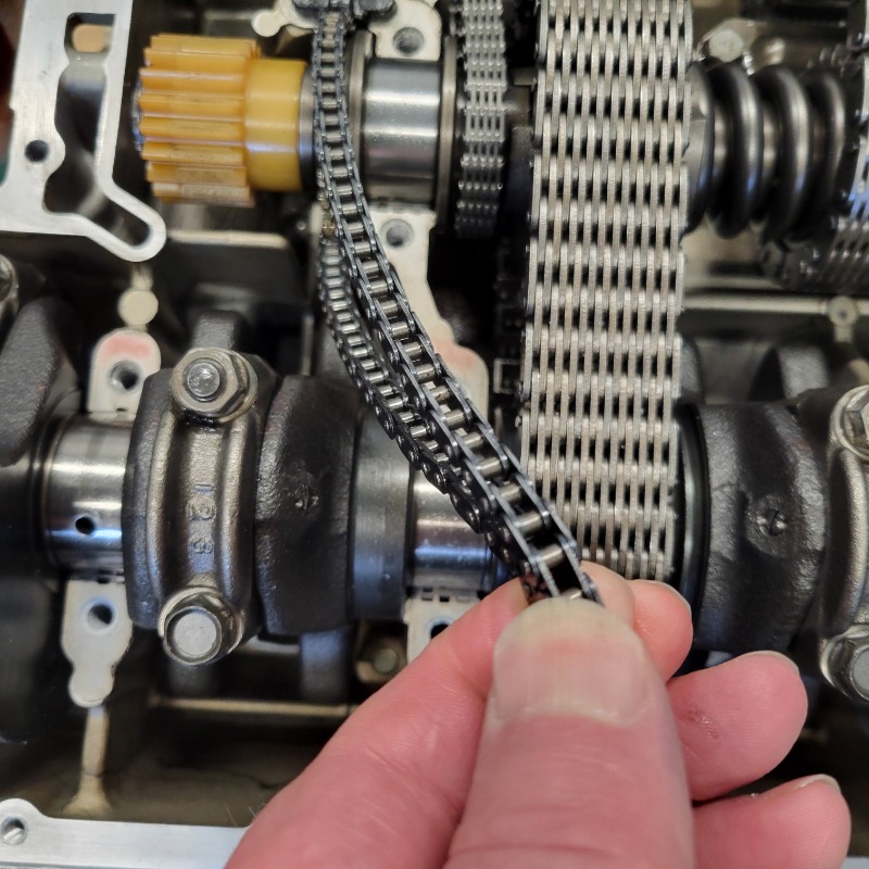 I've spent the last couple of days tapping out the casing half joint bolt holes, while staring at the new primary, secondary and camshaft chains, thinking once I add the new oil pump drive gear, I'm just about ready to reassemble the engine. then I look at the tiny chain that drives the water pump drive shaft and wonder if I shouldn't replace it for peace of mind. So I grab the chain and flex it sideways to try and determine the wear of the chain. Roller chains when new might flex 10-15 degrees to each side. this one I can bend almost 45 degrees like Bobby Hull's curved blade hockey stick. ( now that might give you a hint to my age). There's no spec in the manual for measuring the chain for wear, so it's a judgement call. Yup, replace the chain is the thinking because if the chain breaks, I'll be on the side of the road which is something a mechanic would NEVER admit to and when it breaks, I'm sure it would get snarled up in the new oil pump drive gear. So not worth taking a chance.
