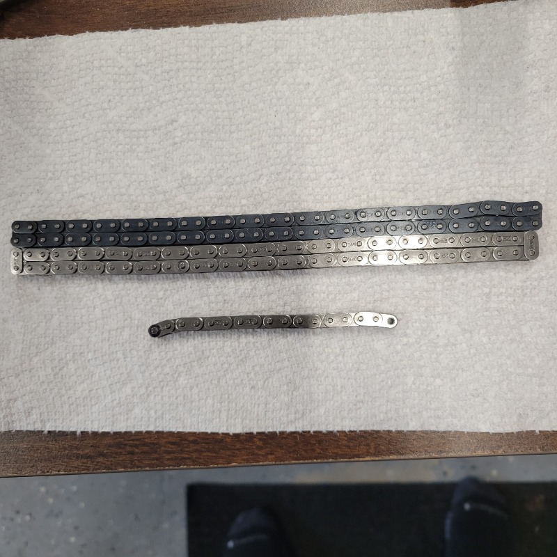 What's interesting is that the upper half of the old chain is longer than the lower half of the old chain suggesting that the stretch in the chain is not evenly distributed. Not uncommon but strange that I layed the chain out for a pic and this is what was revealed.