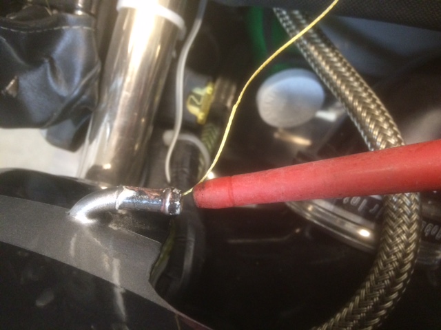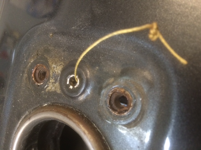 While on the topic: You can ensure your vent is clear by running a pipe-cleaner through it. Pictures are self explanatory. Note: Use some tape or place a rag in the open filler when re & re'ing the cap to avoid dropping the cap attachment screws into the tank ! Make sure your string-knots and the twisted loop in the pipe cleaner are secure ! Both ends of the pipe cleaner should be "strung". This way, If one end comes off in the vent you can pull it back out with the other end! To get the string through the vent tube, Tie several knots in one end of the string, insert it into the vent and use compressed air to blow it through. Works like a charm. If it won't then you either have the knots too large or there is an obstruction which will require you to reduce the size of the knot until it will pass through. Use a white or light colored pipe-cleaner to witness any debris. You might be surprised what comes out !