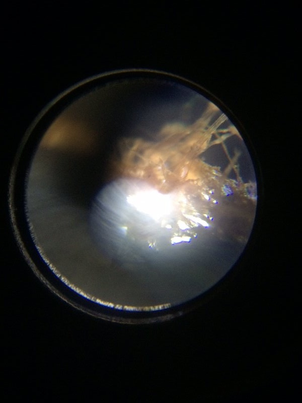 1/2" to 1" very fine strands that look like "Pet Fur". Organic looking "stuff" some of which seemed similar to insect bits and pieces and saw some clear images of what I can only refer to as "crystalline" in nature. Lots of "fuzz", in general.