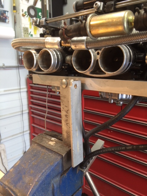 YES, the carbs when mounted are at (about) a 5 degree tilt DOWN towards the engine. NOT an issue ! A "Leveling Cradle" is a good idea. Any manner of holding the carb(s) steady and level on the bench is a necessity ! I have two methods for doing this depending on whether I'm adjusting the float levels with the carbs as a complete set or individually. This is how I hold a "set". The Carb-mount needs matching two holes.