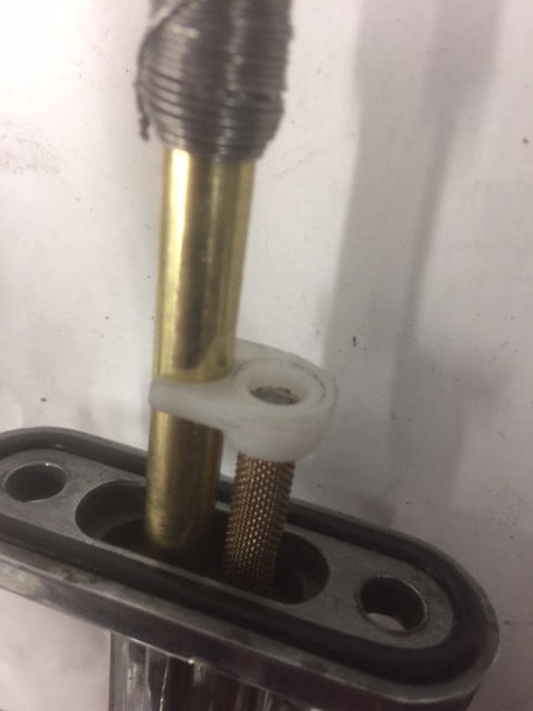 The RESERVE filter was the brass-mesh screen taken from a "Coleman camp-stove "fuel-funnel". Cut the originally round piece into a square and rolled into a tube with an over-lap of several millimeters. The "top" is sealed with solder. The bottom 5-6 mm is soldered around the perimeter and sanded smooth until it fit snuggly into the RESERVE port. A small steel washer limits the screen depth. I didn't use any sealer as the fit of the screen into the port is sufficient. A nylon "clip" is just an additional means of securing it.