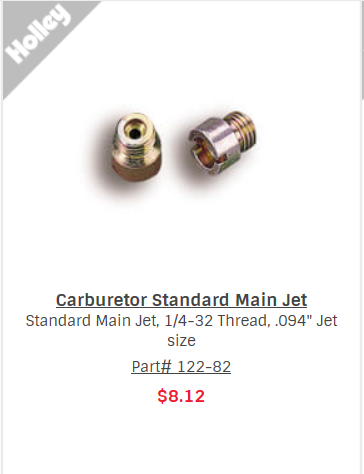 In keeping with his idea of a more "factory" appearance and preferring the flexibility of using a range of orifice sizes I did some digging and found that Holley has jets that have a 1/4"-32 thread and are available with a .094" orifice which matches the 3/32" that I've suggested.