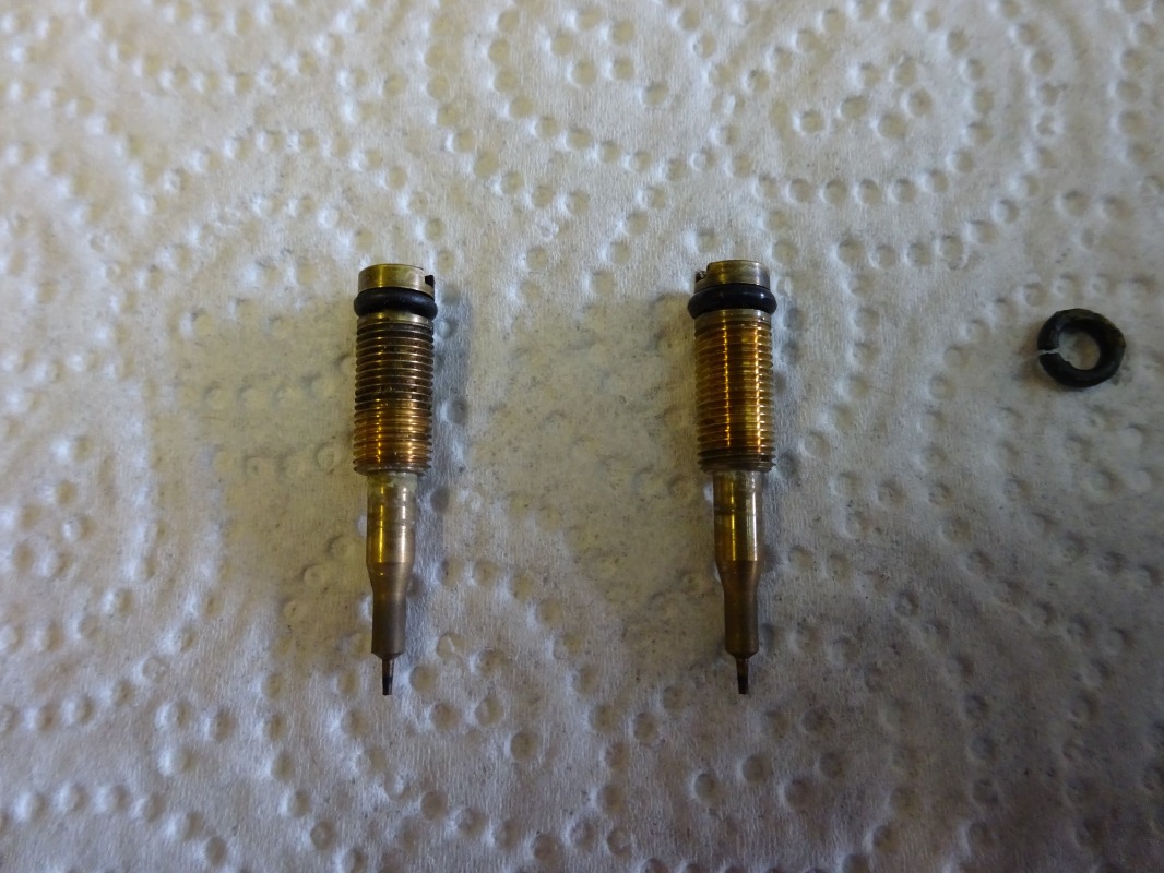 I then cleaned all of the jets and carb passages with STP Carb Cleaner – this seems to share a number of constituents with cellulose thinners or “lacquer thinners” as sometimes referred to as was very effective in cleaning the channels/jets as well as melting anything plastic including some of my protective gloves. I also replaced the “O” rings on the pilot jets as the 40+ year old originals had gone very hard and were probably leaking. (original “O” ring on left, new one on right)