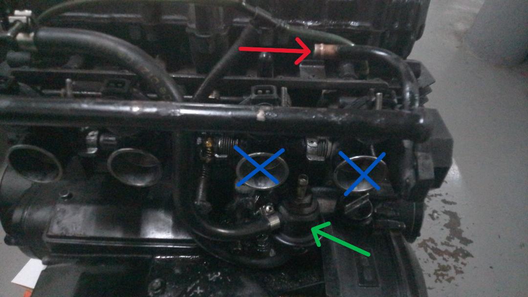 The fuel enters through the red arrow tube, it seems that there is an excess of pressure that cancels out cylinders three and four, while cylinders one and two work.