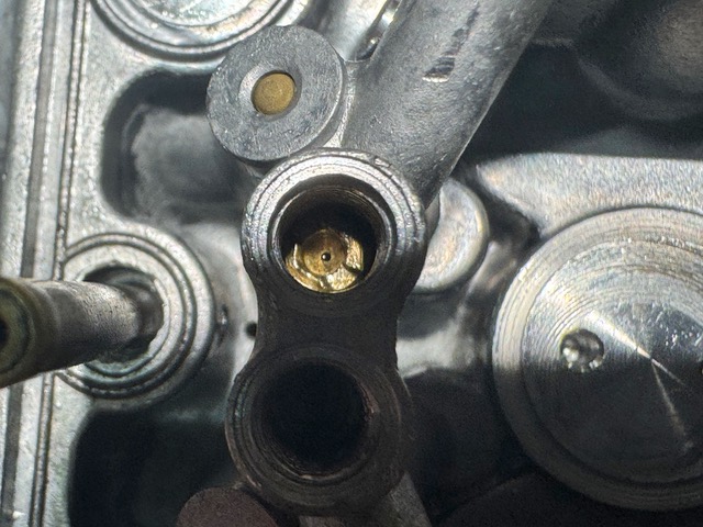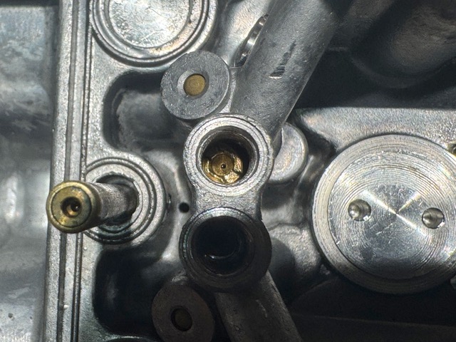 In one of the carburetor bodies, the idle jet unscrewed just fine. Nice and easy. Normally turn the carburetor upside down, and the silly thing falls out.