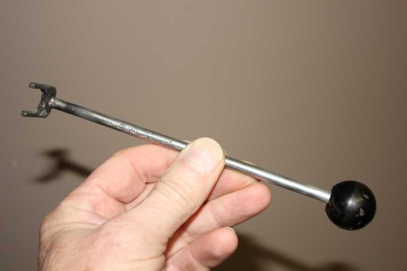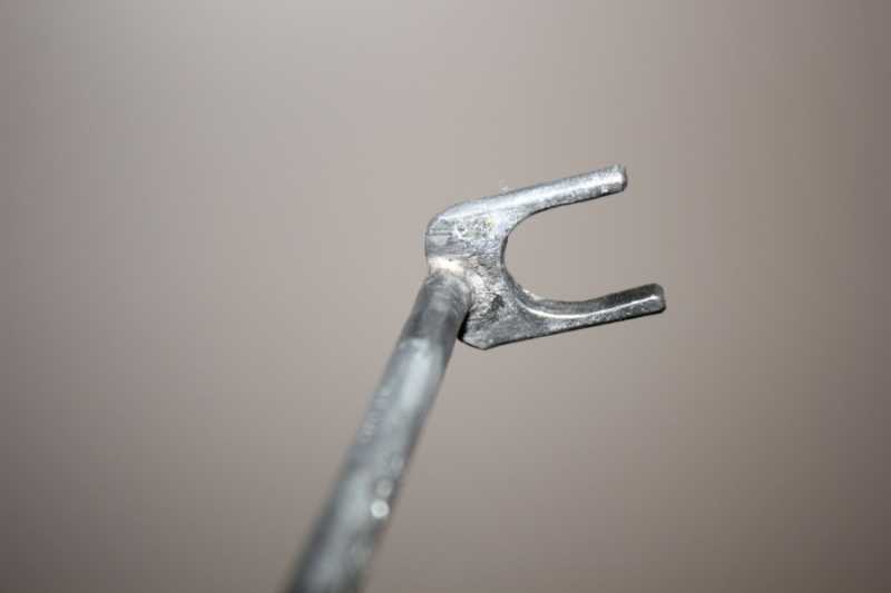 I'm lucky in that Iv'e got long fingers so getting both my index fingers in under the tank to wriggle the line off hasn't been that bad but; get a drop of fuel on the line and it gets too slippery to pinch and push. I came up with this: Another home-made tool that works perfectly for this task. By placing the fork on one side of the clamp or the other (In my fuel-line routing case the clamp at the inlet side of the fuel-filter), I'm able to push the line off or pull the line on. Pulling the fuel-line back onto the barb only requires that I align the end of the line with the barbed end of the pet.-cock. Once aligned I can easily pull the fuel-line back on.