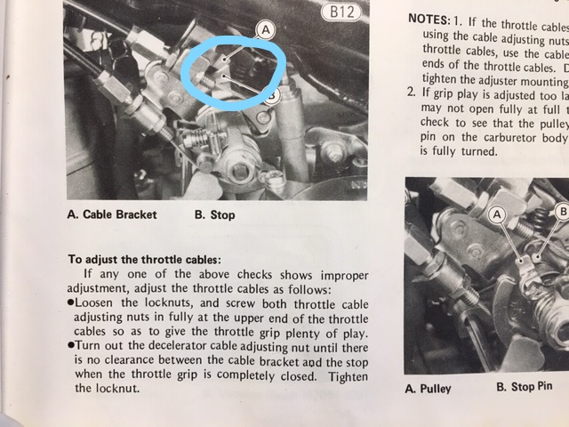 I think this is a great question as its bugged me for years I ended up adjusting the cables by feel in the end because like yourself I could never figure out how to get that gap to close the way its described in the service manual. Hopefully Scotch may have some input as the carb guru on this site.