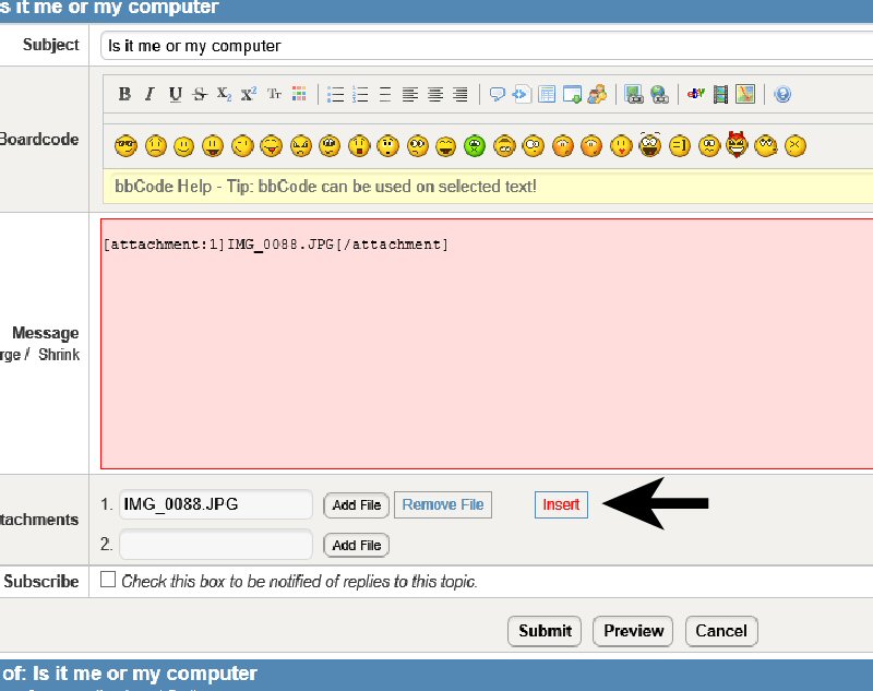 11 years 1 month ago - 11 years 1 month agoTorque59 wrote: When I preview the content it shows my text and the attachment number / file but when I submit it nothing happens. The computer sits there and thinks about it, then seems to time out without uploading anything.