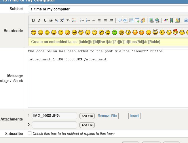 If you select "Add File" a thumbnail will be attached to your post. Choose this option if folks who might be on dial up would have to wait too long for the post to open. After they read your post, they can choose to view the actual picture if they choose.