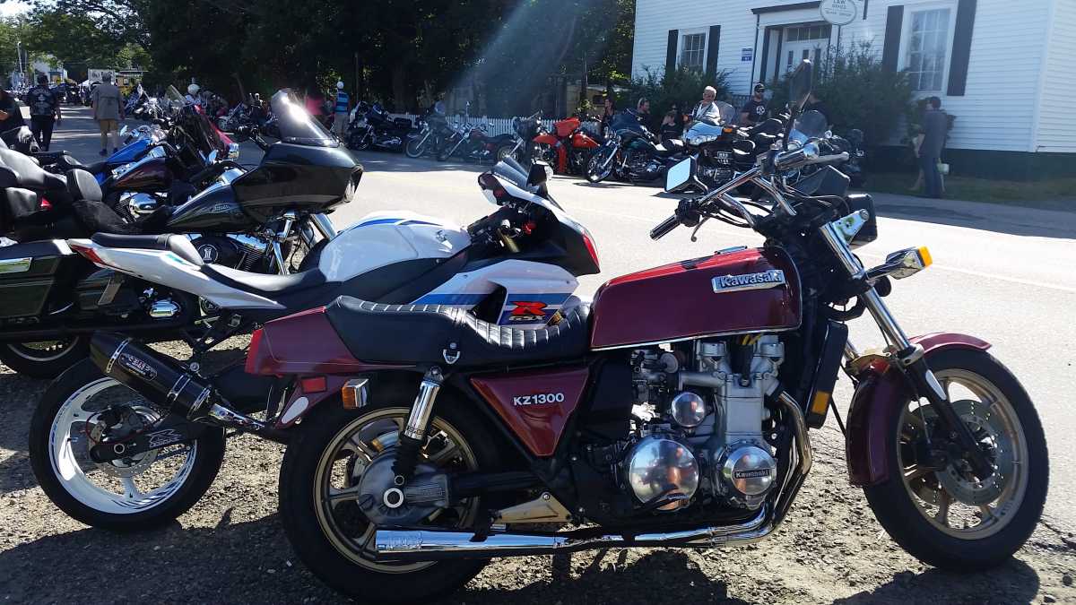 There was probably 20,000 bikes and I only saw one other vintage kawi. Looked to be a 77 kz1000 as it drove by. The old 1300 got a lot of attention and pictures. Great day for a ride, low 20s but the traffic there was insane. It is a tiny little town. We parked at the beginning but the was a kilometer or more of bikes in some places 4 lanes deep. I should have taken more pictures but I have some video I will upload at some point. My friend with the Gixxer was running a GoPro on the way down.