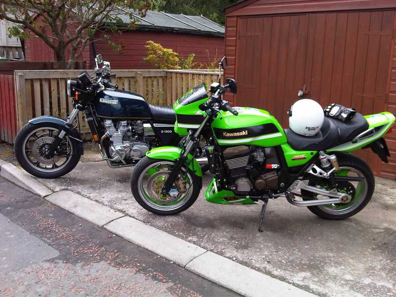 On this subject of Roberts beautiful creation, I came across the photo below I took a few years ago of my own ZRX1200R parked alongside Dave D's very good & original Z1300A1.