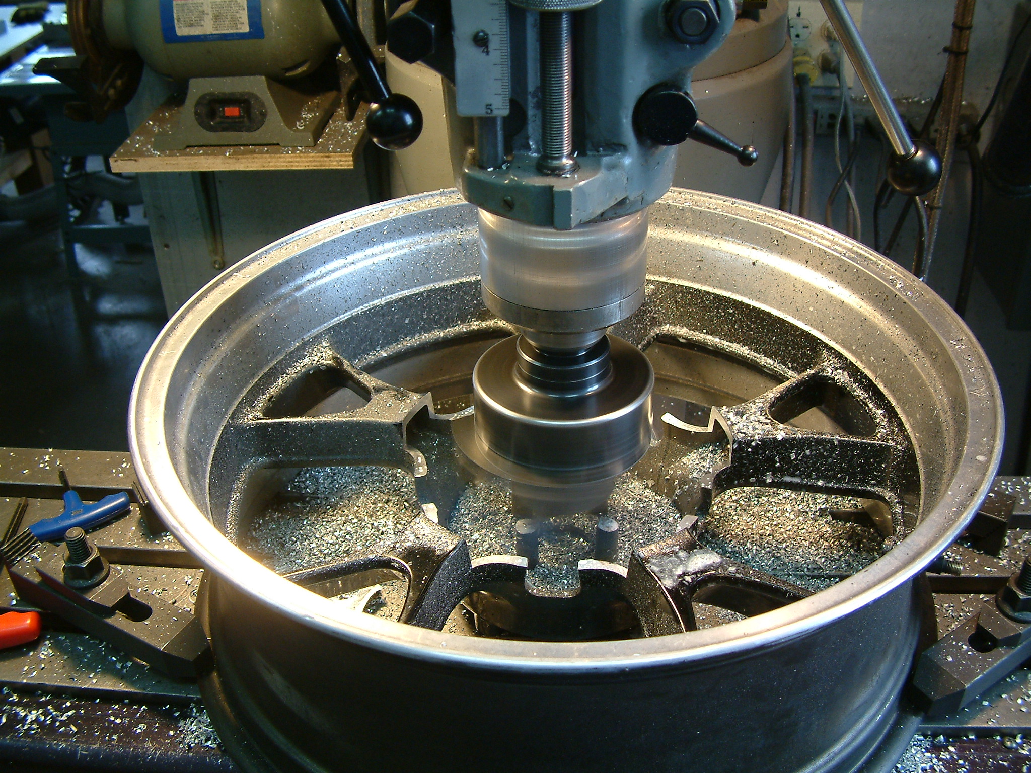 I used the original center of KZ1300 1982 The wheel come from a ZX14 and I removed the center and cut the left side of an inch machined and welded the two pieces together. Both wheels are machined and welded together. All welds were made with a TIG. The wheel turns strait.