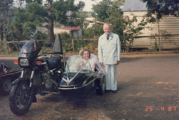 The Grooms bike with the bride in it and the father of the bride, heck that safari suit looks groovey, we won't go into the "sissy bar" on the bike, but what the heck is that bikini fairing off of, it's not a proper 13 one ????