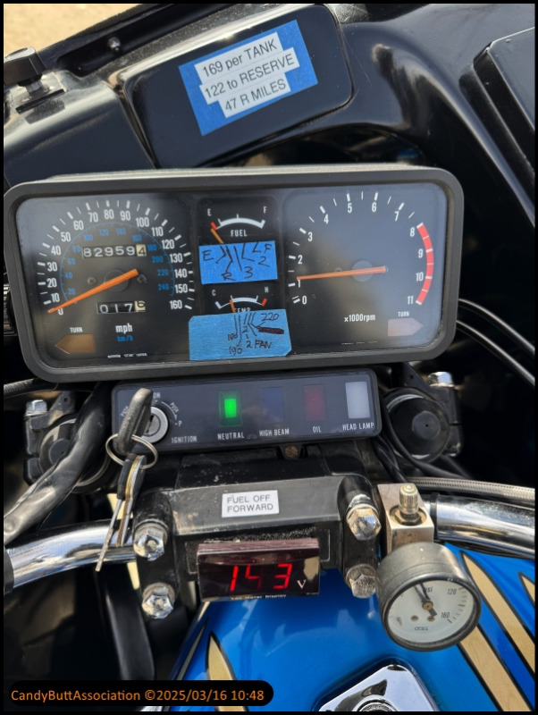 Your marks on the fuel gauge are both funny and shameful on the part of Kawasaki. Fuel gauges have been engineered long enough that there's no excuse for that degree of inaccuracy. I once owned an '83 Honda Interceptor whose fuel gauge was so off that when it read 1/2, you were down to 1/3. By the time you were near the red, you could see the gauge move.