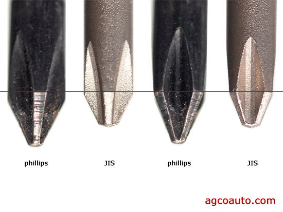Note the dimple mark on the head of the JIS screw. The main difference in the screws are, the Phillips head screws have a radius corner on the inside corners where the JIS screws have square edges and the Phillips is tapered to the bottom where the JIS has a flat bottom.