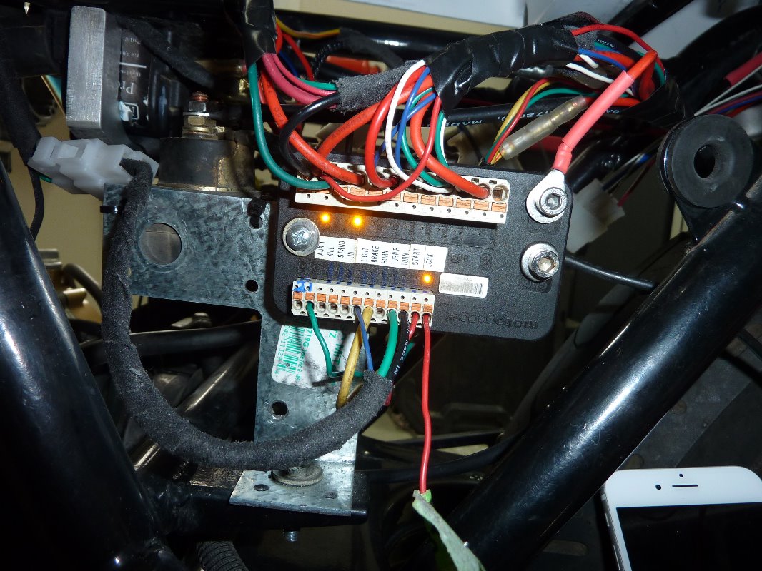 Wiring from scratch - once all accessories and components are in place and decided on, it is a rather simple process of running a trigger wire / on/off switch wire to the m-unit, and a return wire back to the end user. Every circuit needs a grounding , so I used a ground block mounted under the tank for all the components around the handlebar area and another one mounted under the right side cover for the rear applications.