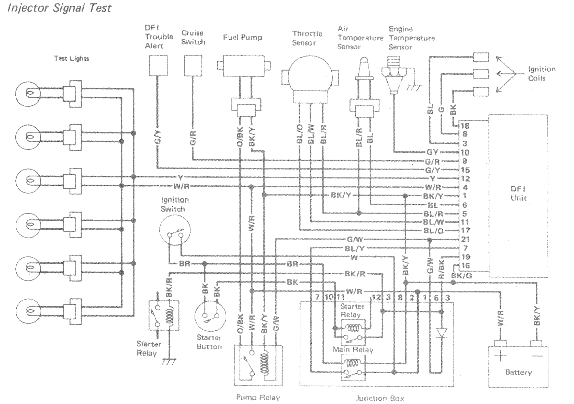 So I'm trying to wire in the DFI warning light to my aftermarket gauge. The plug for the DFI has a G/R wire that would go to the dash, and a G/Y that goes to the cruise switch. Does anyone know what the wires actually do? The bike was gutted when I got it and the original dash and most switches are gone.