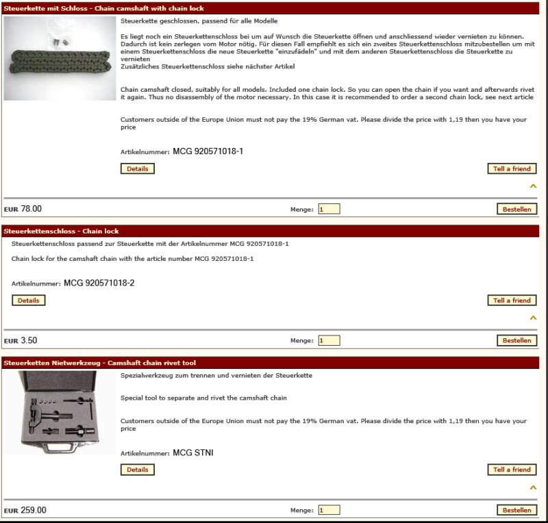 A few years ago there was an e-bay seller who had cam chains on e-bay - claiming they were oem, so I bought one. But due to the rather daunting task of having to strip the engine down to the crankshaft to remove the old chain, I decided to leave it. And now with 80,000km's on the engine there still doesn't seem any need to replace it. And all the discussions on the old forum, this topic never came up.