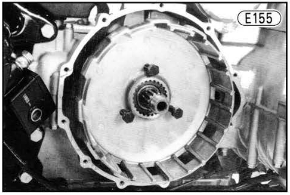 Just a thought Paul, Page 87 in the manual pic E153 what if you remove circlip #9, washer #10 and spring plate pusher #11 and left the rest of the clutch intact and put a strap wrench on the outer diameter of the clutch basket down near the base of the hub to hold the clutch while you remove the nut. That would use the clutch plates and friction plates to hold the inner hub while you remove the nut. Disassemble the rest of the clutch after that. .The only concern here is that the fiber friction plate tabs will bear some load so a little care here and I think you'll be fine.
