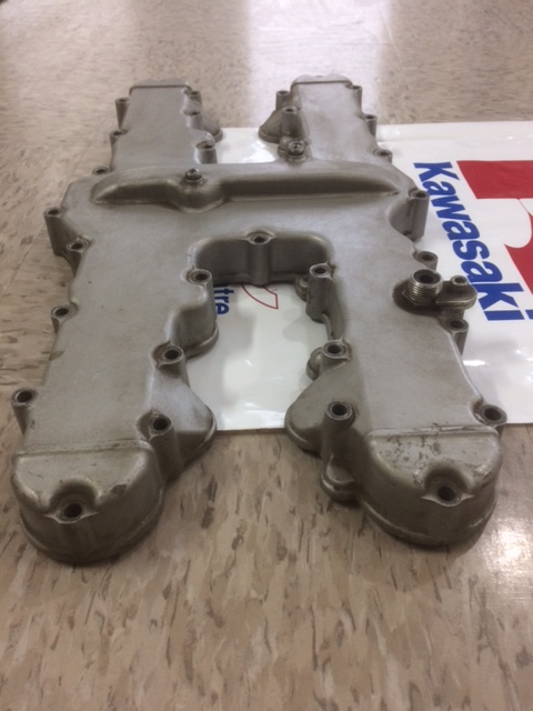 Found this by sheer luck at a Canadian Kawi. dealer that was cleaning off the shelves of old/obsolete parts! As produced by the factory it did have some miles on it judging by some light dirt/oil. Never see one without the Air-Injection housings!