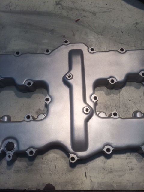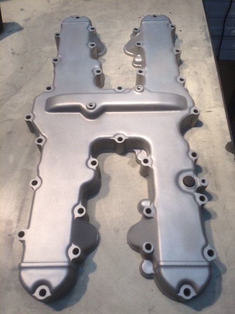 Today I got started on the cover by dressing the gasket face. I removed the factory milling marks to encourage the gasket to stay on the head and release from the cover.. The cover proved to be flat so the resurfacing went quickly. Then into the cabinet for some glass-bead. The factory silver coating was thin so this task went quickly as well, despite the cover being a bit tight and awkward to manoeuvre in the small cabinet. I was surprised and thankful to find no dings or scratches. This alone reduces the work by 50% ! The couple of rough spots in the casting at several bolt-bosses can be sanded out. The casting is quite porous. I must block-sand it to avoid weird distortions created when hand-sanding. I called it a day with the top of one "arm" done with 400 and it's ready for the next step - 800.